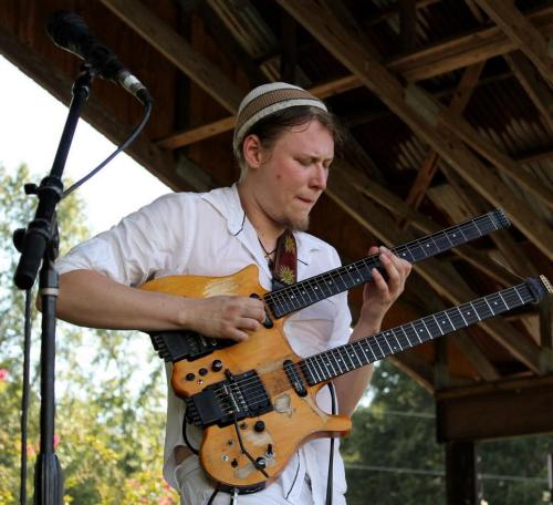 With a storm threat successfully averted, the heat and humidity had already made their comeback when Consider The Source’s turn on the stage arrived. The three young band members, all dressed in white, loose-fitting clothing that gave a nod to the Eastern component so prominent in their music, were not exactly well-known to most of the crowd, in spite of being very active on the live circuit of the New York/New Jersey region. Like other bands invited to perform at prog festivals for the first time, they were not familiar with the progressive rock scene, as they had previously associated the genre with the symphonic bands of the Seventies and their devoted followers. With four albums under their belt, and extensive touring experience both in the US and abroad, they were obviously very much at home on a stage. Dashing guitarist Gabriel Marin, his blonde mane hidden beneath a quirky cap, sported an obviously custom-made contraption – a fretless double-necked guitar – that allowed him to produce a wide range of sounds. Like many modern instrumental bands, they had a hard, almost metal edge that elicited comparisons with the likes of ProgDay alumni Canvas Solaris and Scale The Summit, though tempered by the warm, organic sound of ethnic percussion. The Indian influence, though less evident than in a quintessential “Indo-prog” band like Shakti, came often to the fore, seamlessly intertwined with fiery fusion and hypnotic space-rock cadences, driven along by bassist John Ferrara and drummer Louis Miller, who tackled elaborate, King Crimson-style polyrhythms with consummate skill. Like a bare-bones Mahavishnu Orchestra (stripped of violin and keyboards) on massive amounts of steroids, modern enough to appeal to the younger, jam-band set, but also with a clear jazz-rock bent – occasionally laced with a funky swagger – that emerged particularly towards the end of their set, Consider The Source took no prisoners, and their blistering performance earned them many new fans.