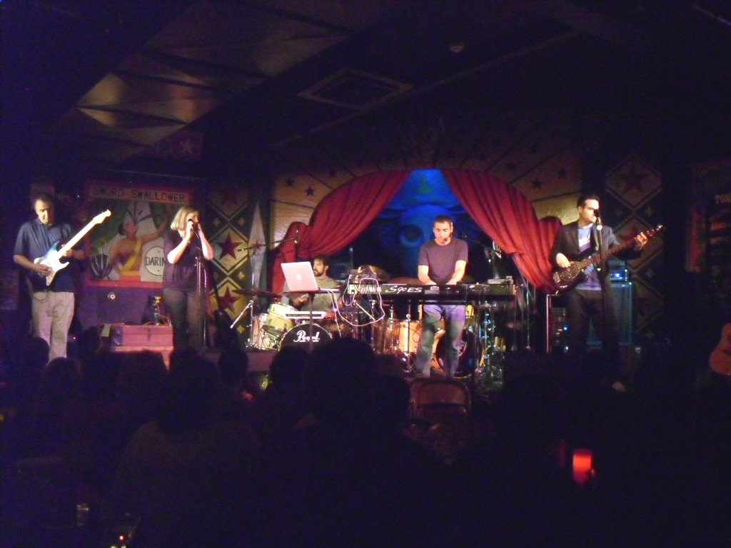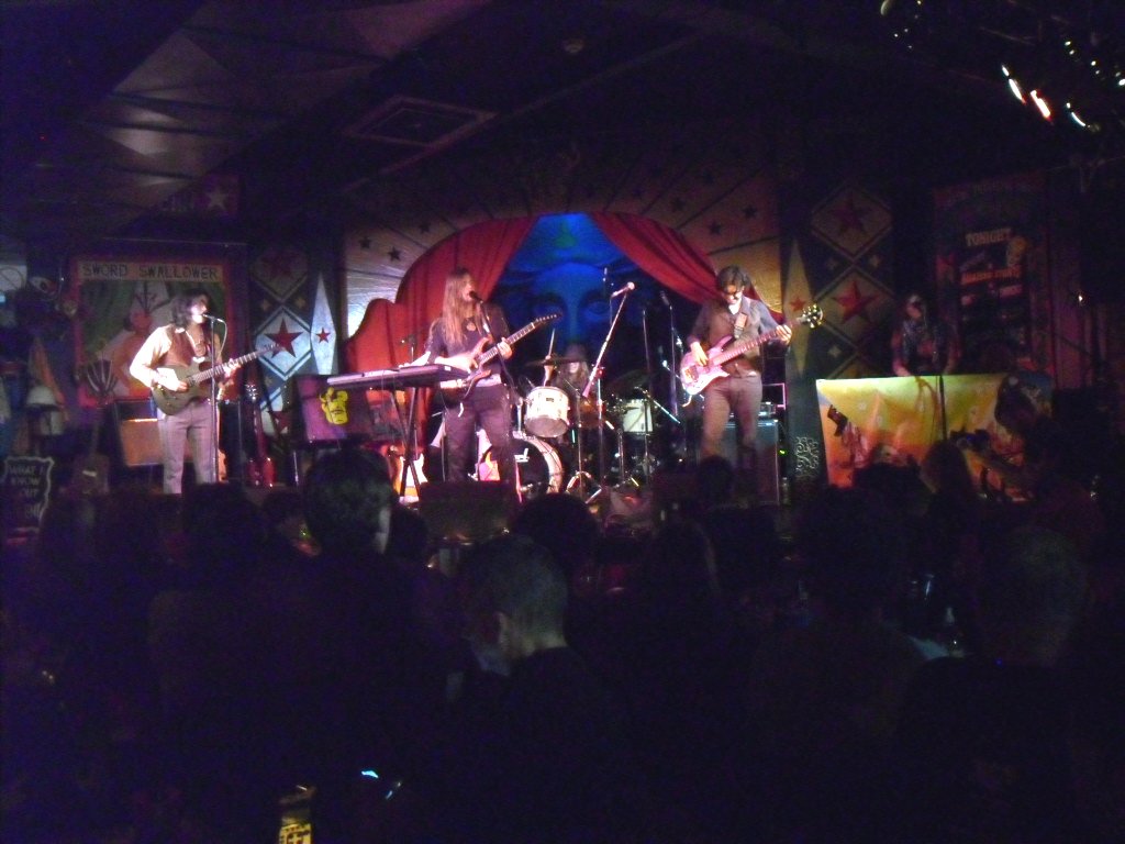 The Tea Club are part of a restricted number of bands whose career I have been following since its inception. The outfit led by brothers Daniel and Patrick McGowan, though plagued by growing pains (i.e. frequent lineup changes) has been going from strength to strength, adding layers of complexity to the energetic punch of their debut album, and blending a boldly modern direction with their very personal homage to the past. Young and good-looking in their fashionably bohemian attire, with the McGowan brothers and drummer Joe Rizzolo (a very talented musician with a jazz background) sporting flowing locks that would have looked great in a shampoo commercial, they played a set that emphasized their mastery of quiet-loud dynamics. Intense electric flare-ups, packed with frantic riffs, effortlessly morphed into soothing passages embellished by Renée Pestritto’s pastoral flute, while the brothers’ strong, high-pitched voices – Dan’s more melodic, Pat’s assertive, with a touch of banshee wail – merged smoothly with the instruments. New bassist Jamie Wolff complemented Rizzolo’s agile, accomplished drumming style, propelling the band’s trademark crescendos and beefing up the guitars’ relentless riffage. While the influence of the likes of Radiohead is clearly detectable, The Tea Club have woven subtle but hard to miss classic prog elements into their sound – particularly evident in the material from their latest CD, Quickly Quickly Quickly, performed here in its entirety. Some entertaining visual props – in the shape of a large, top-hatted wolf stuck to Dan’s back – were also introduced during their performance of “The Eternal German Infant” at the close of their set.